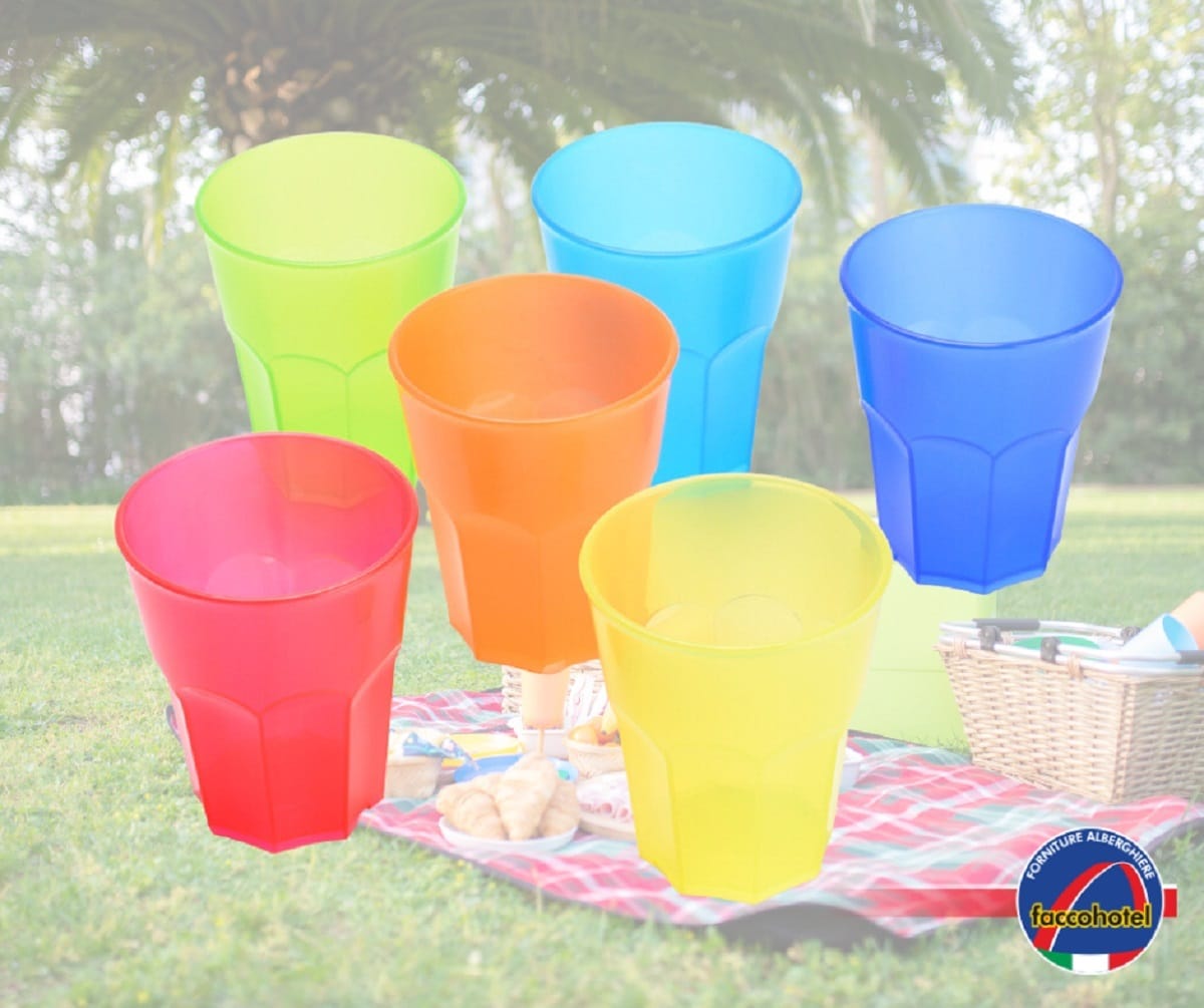Questi bicchieri sono disponibili in vari colori, arancione, blu, giallo, rosso, azzurro, bianco satinato, viola, giallo e verdino, l’ideale per rallegrare le nostre tavole. Si possono acquistare su www.faccohotel.com al costo di 0,70 €, IVA esclusa.
